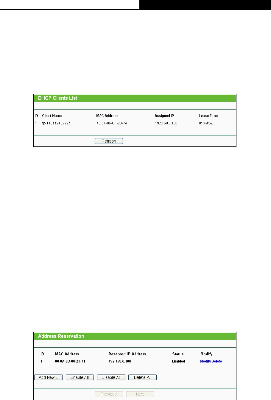 Choose menu “DHCP → Address Reservation”, you can view and add a reserved address for