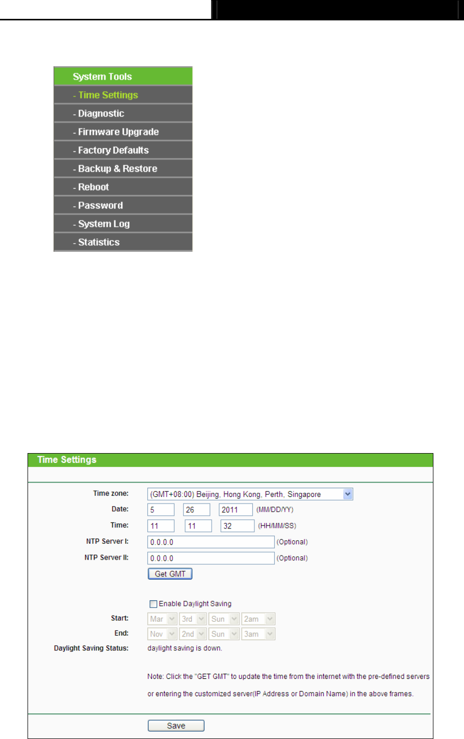 Choose menu “System Tools→Time Setting”, and then you can configure the time on the