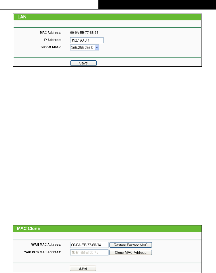 Choose menu “Network → MAC Clone”, you can configure the MAC address of the WAN on
