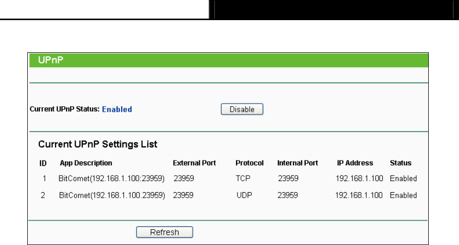 ¾ Current UPnP Settings List - This table displays the current UPnP information.