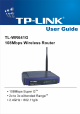 TL-WR641G 108M Wireless Router User Guide Package contents The following contents should be found in your box: ¾ One TL-WR641G 108Mbps Wireless Router One AC power Adapter for TL-WR641G 108Mbps Wireless Router Quick Installation Guide One Resource CD for TL-WR641G 108Mbps Wireless Router, including: ¾ • This Guide • Other Helpful Information Wall-mounting screws ¾ ¾ ¾ Note: If any of the listed contents are damaged or missing, please contact the retailer from whom you purchased the TL-WR641G 108Mbps