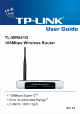 TL-WR641G 108M Wireless Router User Guide Package contents The following contents should be found in your box: ¾ ¾ ¾ ¾ One TL-WR641G 108Mbps Wireless Router One AC power Adapter for TL-WR641G 108Mbps Wireless Router Quick Installation Guide One Resource CD for TL-WR641G 108Mbps Wireless Router, including: • This Guide • Other Helpful Information Note: If any of the listed contents are damaged or missing, please contact the retailer from whom you purchased the TL-WR641G 108Mbps Wireless Router for assist