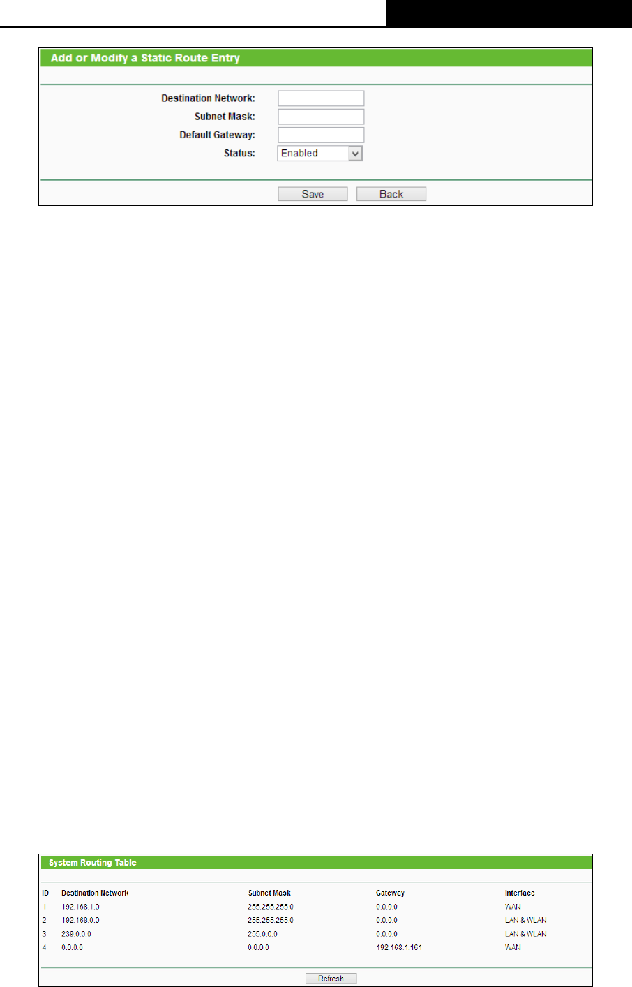 valid route entries in use. The Destination IP address, Subnet Mask, Gateway, and Interface will