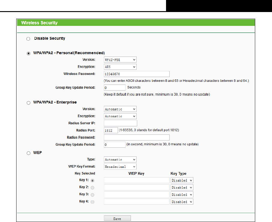 Disable Security - The wireless security function can be enabled or disabled. If disabled, the