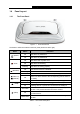 TL-WR842ND 1.4 300Mbps Multi-Function Wireless N Router User Guide Panel Layout 1.4.1 The Front Panel Figure 1-1 Front Panel sketch The Router’s LEDs are located on the front panel (View from left to right). Name (Power) (SYS) Status On The device is powered on. Off The device is powered off. Off The device has a system error. On The device is initialising. Flashing (Wireless) (LAN 1-4) (Internet) (USB) (WPS) Indication The device is working properly.