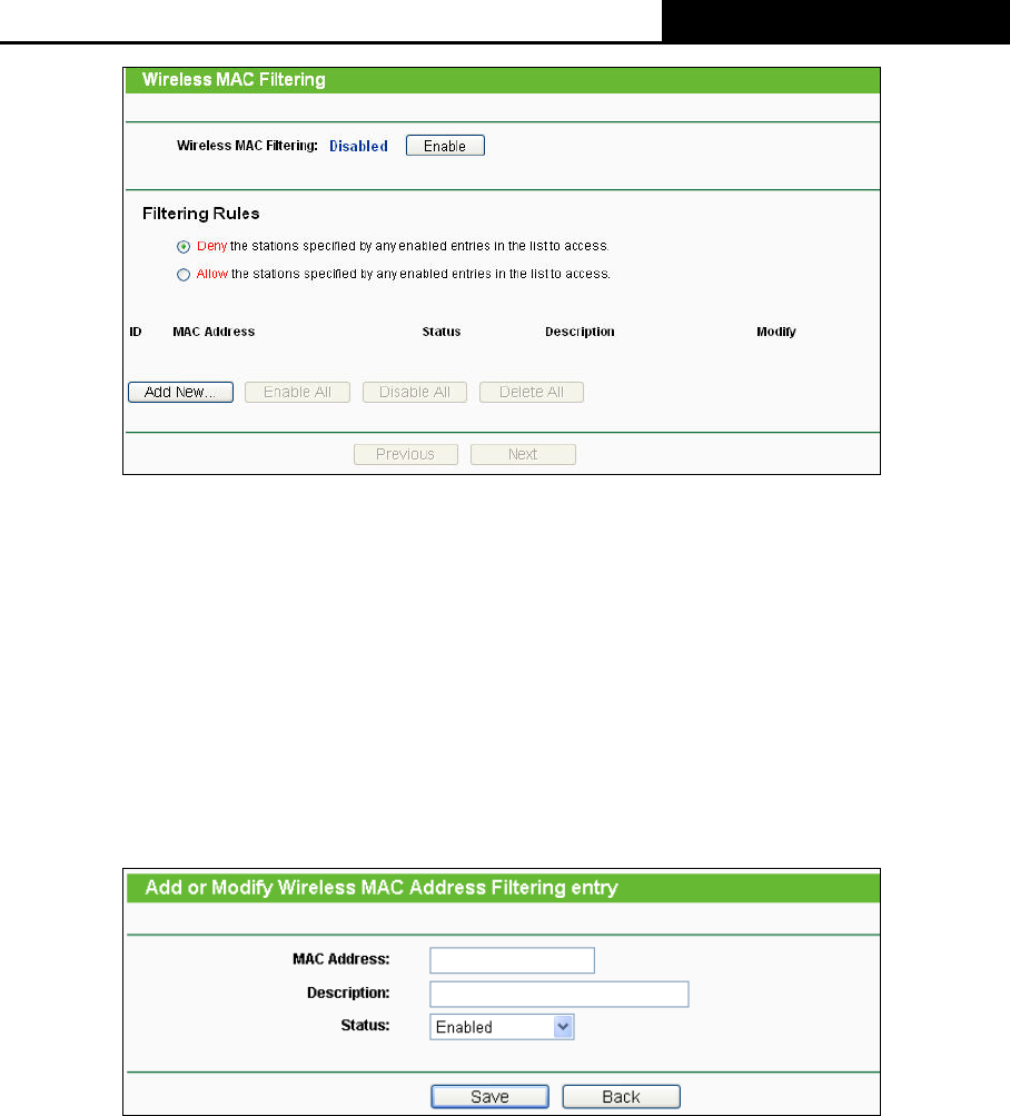 Wireless MAC Address Filtering entry" page will appear as shown in