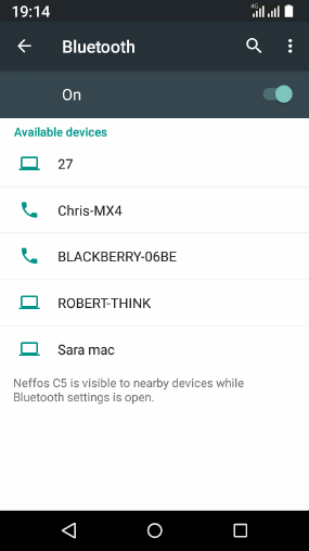 2. Tap the switch to turn it on. When Bluetooth is first turned on, it scans for nearby Bluetooth devices and displays