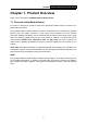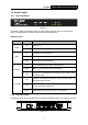 TD-8840T ADSL2+ Modem Router User Guide 1.3 Panel Layout 1.3.1 The Front Panel Figure 1-1 The Router’s LEDs are located on the front panel (View from left to right). They indicate the device’s working status. For details, please refer to LED Explanation. LED Explanation: Name Status Indication On Power is on. Off Power is off. On The ADSL port is linked up. Power ADSL Internet 1~4 (LAN) Flash The ADSL negotiation is in progress. Off The ADSL port is linked down.