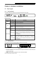 TL-R600VPN SafeStreamTM Gigabit Broadband VPN Router User Guide Chapter 2. Hardware installation 2.1 Panel Layout 2.1.1 The Front Panel The Router’s LEDs are located on the front panel (Viewed from left to right). Figure 2-1 LED Descriptions: Name PWR SYS Status Indication Not lit The router is powered off. Lit up (Green) The router is powered on. Not lit The router has a hardware error. Lit up (Green) The router has a hardware error. Flashing (Green) Not lit The router works properly.