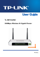 TL-WR1042ND 300Mbps Wireless N Gigabit Router Package Contents The following items should be found in your package: ¾ TL-WR1042ND 300Mbps Wireless N Gigabit Router ¾ DC Power Adapter for TL-WR1042ND 300Mbps Wireless N Gigabit Router ¾ Quick Installation Guide ¾ Resource CD for TL-WR1042ND 300Mbps Wireless N Gigabit Router, including: • This Guide • Other Helpful Information ) Note: Make sure that the package contains the above items.