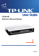 TD-8616B ADSL2/2+ Ethernet Modem User Guide Appendix A: Specification General ANSI T1.413, ITU G.992.1, ITU G.992.2, ITU G.992.3, G.992.4, ITU Standards and Protocols G.992.5 IEEE 802.3, IEEE 802.3u, TCP/IP, HTTP Safety & Emission Ports LEDs FCC、CE 1 10/100M Auto-Negotiation RJ45 port(Auto MDI/MDIX) 1 RJ11 port LAN, ADSL Power, Act 10Base-T: UTP category 3, 4, 5 cable Network Medium 100Base-TX: UTP category-5 Max line length: 6.