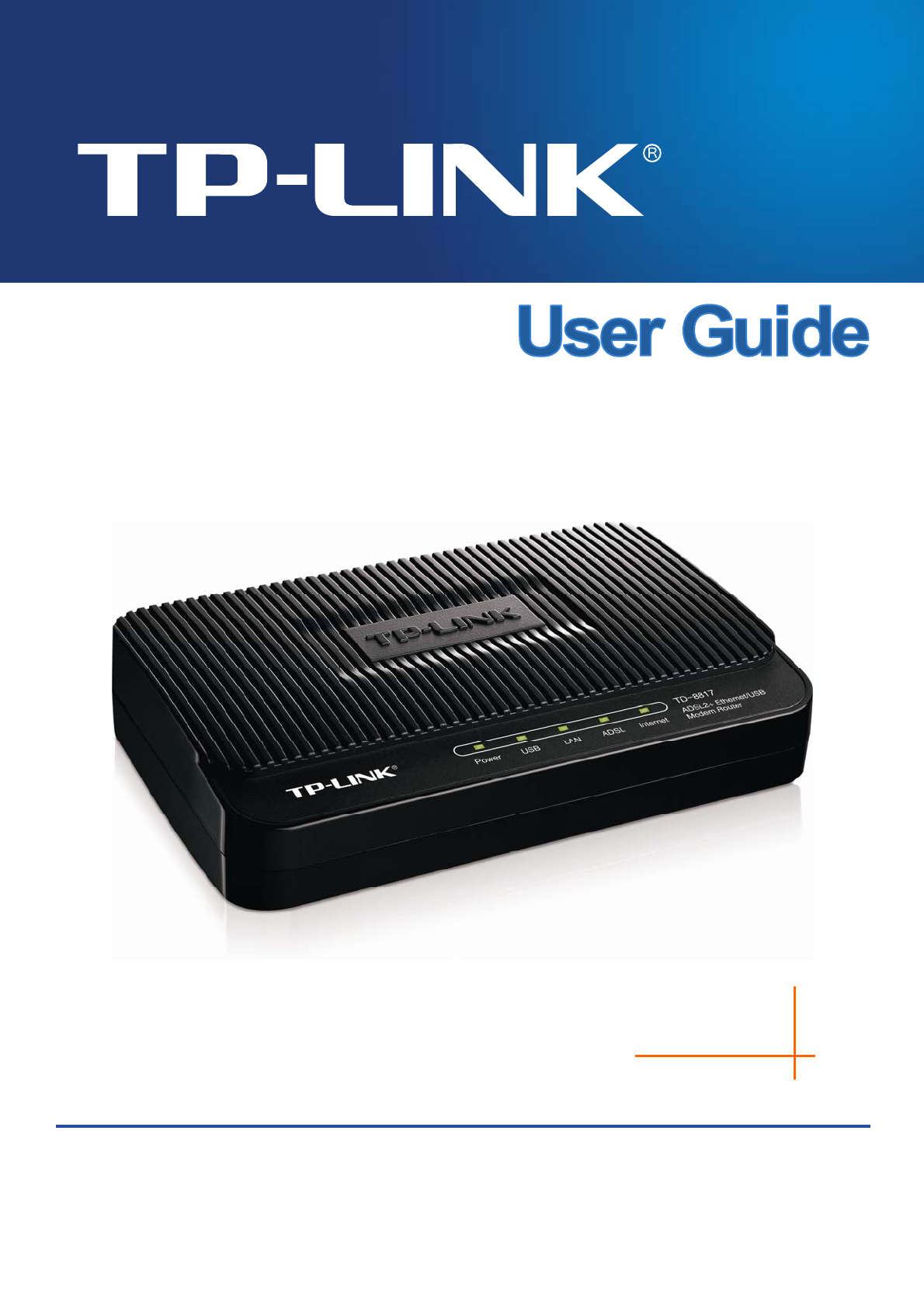 TD-8817 ADSL2+ Ethernet/USB Modem Router User Guide Package Contents The following items should be found in your package: One TD-8817 ADSL2+ Ethernet/USB Modem Router One Power Adapter for TD-8817 ADSL2+ Ethernet/USB Modem Router Quick Installation Guide One RJ45 cable One USB cable Two RJ11 cables One ADSL splitter One Resource CD , including: This User Guide USB Driver Other Helpful Information Note: Make sure that the package contains the above items.