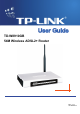 TD-W8910GB 54M Wireless ADSL2+ Router User Guide Package Contents The following items should be found in your package: ¾ ¾ ¾ ¾ ¾ ¾ ¾ One TD-W8910GB 54M Wireless ADSL2+ Router One DC power Adapter for TD-W8910GB 54M Wireless ADSL2+ Router Quick Installation Guide One RJ45 cable Two RJ11 cables One ADSL splitter One Resource CD for TD-W8910GB 54M Wireless ADSL2+ Router, including: • This User Guide • Other Helpful Information ) Note: Make sure that the package contains the above items.