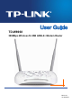 TD-W8968 300Mbps Wireless N USB ADSL2+ Modem Router User Guide Package Contents The following contents should be found in your package: ¾ One TD-W8968 300Mbps Wireless N USB ADSL2+ Modem Router ¾ One Power Adapter for TD-W8968 300Mbps Wireless N USB ADSL2+ Modem Router ¾ Quick Installation Guide ¾ One RJ45 cable ¾ Two RJ11 cables ¾ One ADSL splitter ¾ One Resource CD for TD-W8968 300Mbps Wireless N USB ADSL2+ Modem Router, including: • This User Guide • Other Helpful Information ) Note: Ma