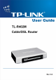 TL-R402M Cable/DSL Router User Guide Package contents The following contents should be found in your box: ¾ One TL-R402M Cable/DSL Router ¾ One AC power Adapter for TL-R402M Cable/DSL Router ¾ Quick Installation Guide ¾ One Resource CD for TL-R402M Cable/DSL Router, including: • This User Guide • Other Helpful Information Note: If any of the listed contents are damaged or missing, please contact the retailer from whom you purchased the TL-R402M Cable/DSL Router for assistance.
