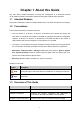 Chapter 1 About this Guide This User Guide contains information for setup and management of TL-SL2210/TL-SL2218 /TL-SL2428/TL-SL2452 Smart Switch. Please read this guide carefully before operation. 1.1 Intended Readers This Guide is intended for network managers familiar with IT concepts and network terminologies. 1.2 Conventions In this Guide the following conventions are used: The four devices of TL-SL2210, TL-SL2218, TL-SL2428 and TL-SL2452 are sharing this User Guide.