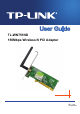 TL-WN751ND 150Mbps Wireless N PCI Adapter Chapter 1 Product Overview 1.1 Package Contents Please verify that all the package contents below are available. ¾ ¾ ¾ One TL-WN751ND 150Mbps Wireless N PCI Adapter Quick Installation Guide One resource CD for TL-WN751ND, including: • • • TP-LINK Wireless Configuration Utility (TWCU) and Drivers User Guide Other helpful information Make sure that the above items are contained in the package.