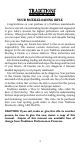 ramrod, between shots is the single most effective thing you can do to optimize accuracy between shots. This not only cleans away the bulk of the fouling, but at the same time lubricates the rifling for ease of loading and reduces the friction of the sabot as it exits the barrel. HELPFUL MUZZLELOADING ACCESSORIES In order to participate fully in the sport, you will probably want to consider the purchase of the various Traditions accessories mentioned in this manual.