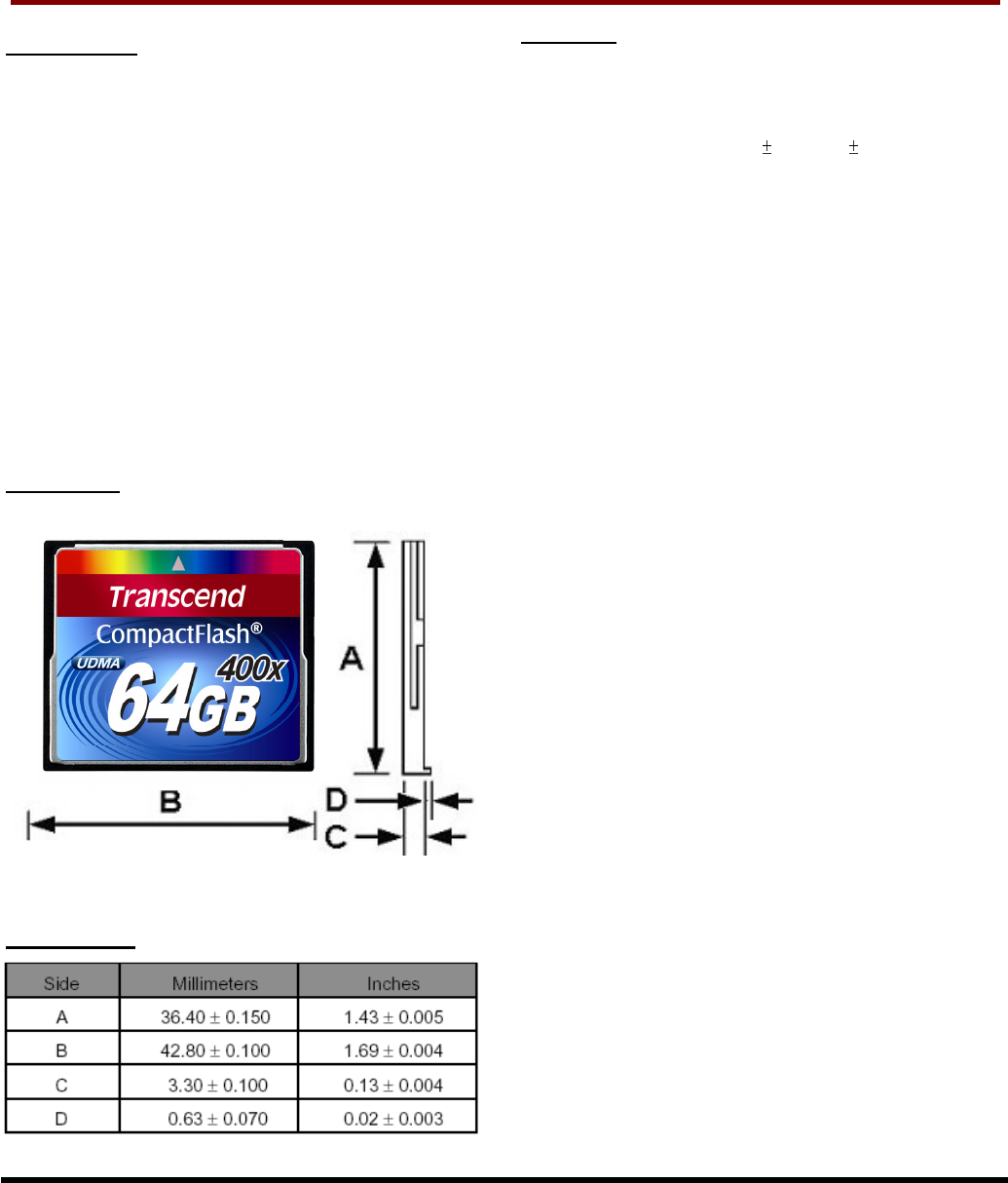 TTS S1166G G~~6644G GC CFF440000 400X CompactFlash Card Specification Interface Specification No Device Driver Required Drivers ATA/ATAPI 7 PIO Mode 0 - 6 ATA Compatibility Multiword mode 0 - 4 UDMA Mode 0 - 6 Physical Specification Form Factor Compact Flash Card Storage Capacities 16 GB to 64 GB Dimensions (mm) Length 36.40 ± 0.15 Width 42.80 ± 0.10 Height 3.30 ± 0.