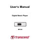 Introduction︱ Thank you for purchasing Transcend‟s MP330, a next-generation MP3 Player that combines all the advantages of lightweight portable music with the benefits of a USB flash drive, and includes many extra features such as an FM radio, advanced digital voice recording, direct Line-In recording, karaoke-style lyrics display, A-B repeat functions and variable track playback speeds. Your MP330 is equipped with a High-speed USB 2.