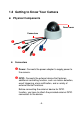 1.2 Getting to Know Your Camera Physical Components Dome cover Connectors Connectors Power: Connects the power adapter to supply power to the camera. GPIO: Connects the external device that features additional controlling function, such as motion detection, event triggering, alarm notification, and a variety of external control functions. Before connecting the external device for GPIO function, you have to attach the provided external GPIO connectors to the device.