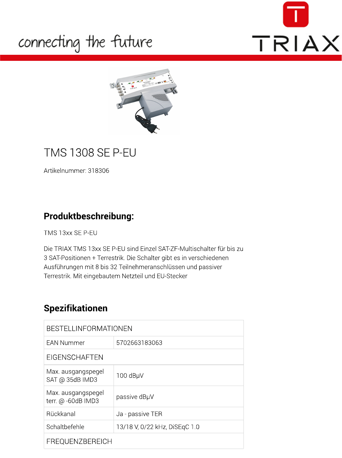 TMS 1308 SE P-EU | Einzelmultischalter | | 318306 3 von 3 http://www.triax-gmbh.de/produkte/satellit/multischalter/einzelmultisc... 18.01.