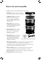 Parts List and Assembly 1) Cover: Promotes warmth and humidity for rapid growth. 2) Sprinkler: Sprinkles water intermittently several times per hour. Extra one is included. 3) 2 Sprouter Trays: Two identical black trays. The seeds sit on the lower tray and are coveredby the upper tray. Both should be facing smooth side up. 4) Water Tube: The green tube is actually comprised of two sections that connect. It channels the water to the sprinkler head.