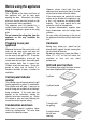 Contents For the user Important safety information Description of the appliance Getting to know your appliance Before using the appliance Rating plate Preparing to use your appliance Control panel indicator neon(s) Condensation and steam Cookware Grill and oven furniture 2 5 6 7 7 7 7 7 7 7 The ceramic hob Using the hob Recommended saucepans Hints & tips 8 8 8 9 The grill Using the grill Things to note The grill pan and handle Hints & tips Grilling chart 10 10 10 10 11 12 The fan oven Using the fan ov