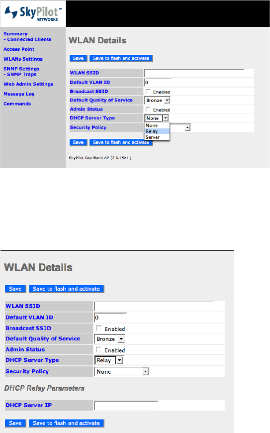Figure 43. WLAN Details page showing DHCP Server Type menu