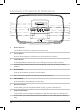 Locations of Controls & Definitions 12 13 14 8. Dimmer Button Press the Dimmer Button consecutively to adjust between low, medium, and high LCD display brightness’. 9. Time Set Button Press and hold the Time Set Button to set the units clock. 10. Sleep Button Press the Timer Button consecutively to set the sleep timer between 60 and 10 minutes (in 10 minute increments). 11. LCD Display 12. Auxiliary Input Use the Auxiliary Input to connect an audio source (MP3 player) to the unit. 13.