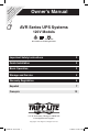 pr ch re R W od an gi e a uc ce ste gi rra t— to r o st n w w nli ra ty w in n w. a e tio tri F to pp R da n: lite EE y f .c Tr or om ip a /w p L ar ite ra nt y Owner’s Manual AVR Series UPS Systems 120V Models Not suitable for mobile applications Important Safety Instructions 2 Quick Installation 3 Basic Operation 3 Storage and Service 5 Warranty Registation 6 Español 7 Français 13 1111 W. 35th Street, Chicago, IL 60609 USA www.tripplite.com/support Copyright © 2010 Tripp Lite.
