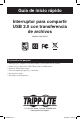 Guía de inicio rápido Interruptor para compartir USB 2.0 con transferencia de archivos Modelo: U230-204-R Contenidos del paquete • • • • • • Interruptor para compartir U230-204-R USB 2.0 con transferencia de archivos Cables (x2) para dispositivo USB, USB A macho a USB B macho Fuente de alimentación externa CD con manual del propietario y controlador Guía de inicio rápido Autoadhesivos del dispositivo 1111 W. 35th Street, Chicago, Il 60609 USA www.tripplite.com/support 200908017.