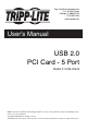 Tripp Lite World Headquarters 1111 W. 35th Street Chicago, IL 60609 USA (773) 869-1234 www.tripplite.com User’s Manual USB 2.0 PCI Card - 5 Port Model #: U234-005-R NOTE: Follow these installation and operating procedures to ensure correct performance and to prevent damage to this unit or to its connected devices. Copyright © 2002 Tripp Lite. All rights reserved. All trademarks are the property of their respective owners. Technical specifications are subject to change without notice.