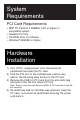 System Requirements PCI Card Requirements: • IBM® PC Pentium II 266MHz CPU or higher or compatible system • Available PCI slot • CD ROM drive for software • Windows® 98/98SE or higher Hardware Installation 1) Turn off PC, unplug power cord, disconnect all peripherals and open the PC case. 2) Find the PCI slot on the motherboard, remove any add-on card blocking easy access to the PCI slot. 3) Remove the USB 2.0 PCI card from the anti-static bag and push it into the first empty PCI slot.