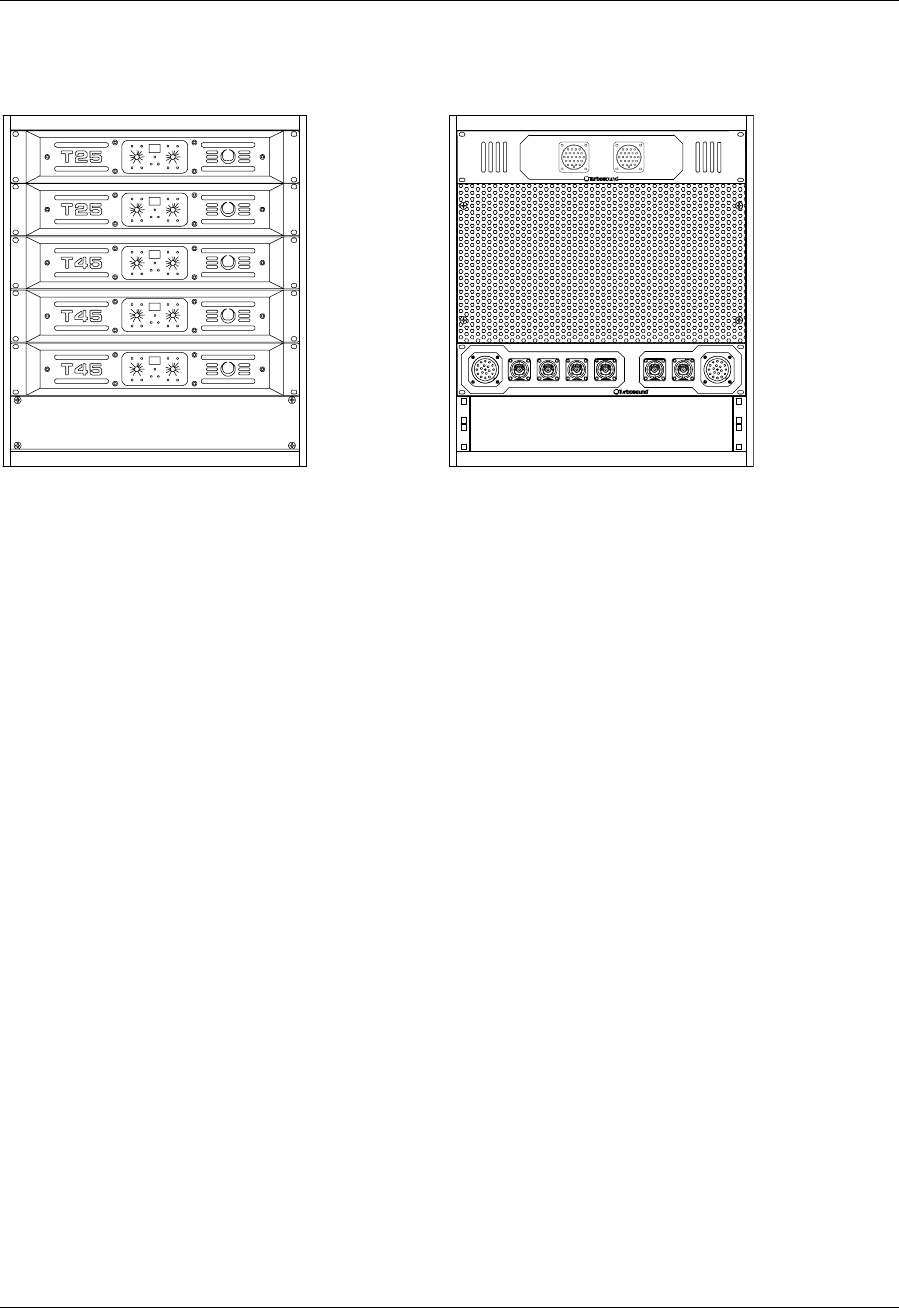 Input and output connectors are mounted on a pair of 2U 19" panel at the rear of the rack.
