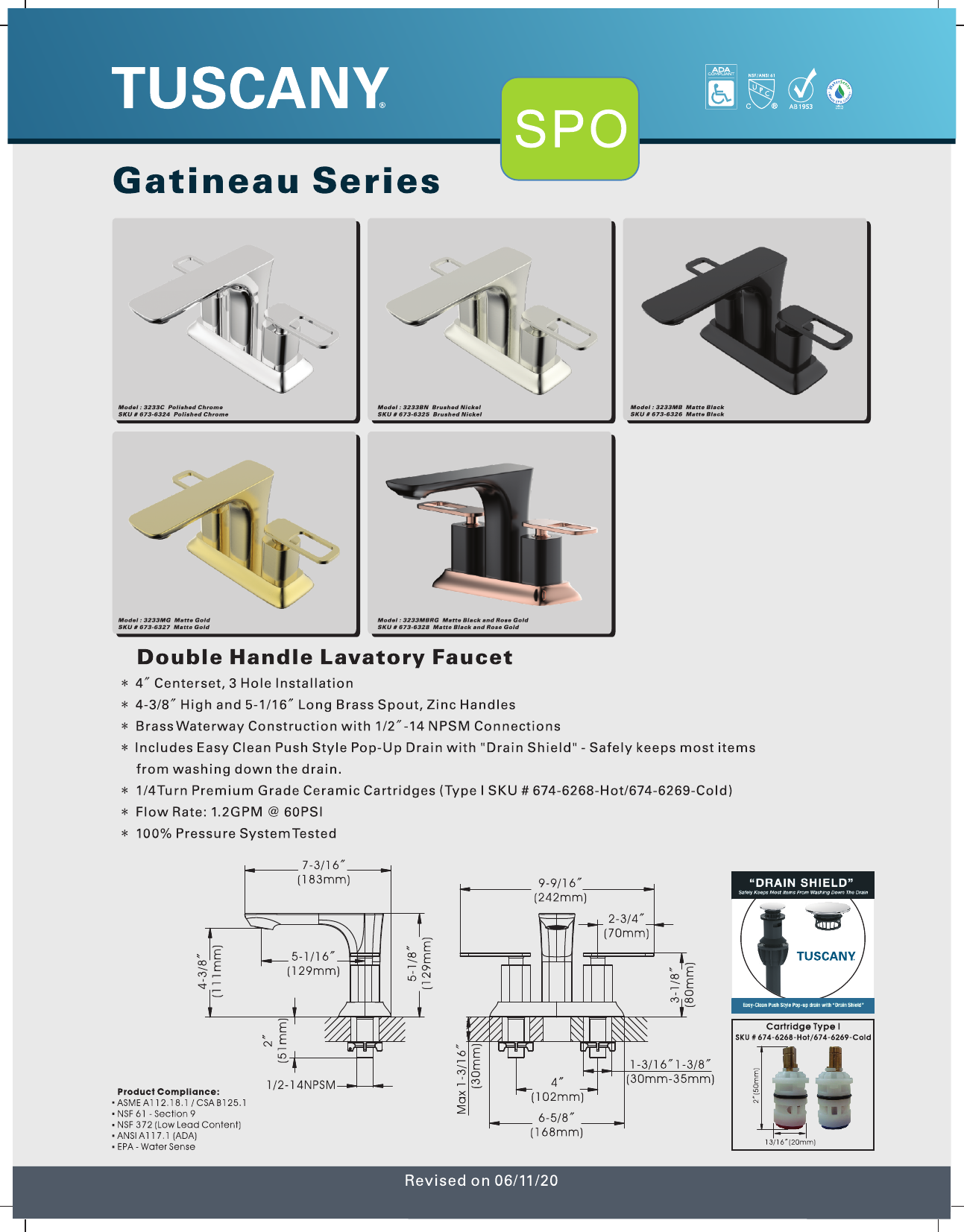 TUSCANY Gateau Series Double Handle Lavatory Faucet % 4" Center set, 3 Hole Installation * High and 51/18" Long Brass Spout, Zinc Handles * Brass Waterway Construction with 1/2" -14 SPASM Connections * Includes Easy Clean Push Style Pop-Up Drain with "Drain Shield” Safely keeps most items from washing down the drain. * Turner Premium Grade Ceramic Cartridges (Type | 5KU # 674 6268 Ho1/674 82689 Cold) * Flow Rate: 1.