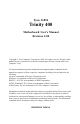Chapter 1 chapter 1 Introduction Introduction Overview The S1854 Trinity 400 is a quality, high performance motherboard designed for Socket 370 Intel Celeron and Slot 1 Intel PII/ PIII microprocessors. The Trinity 400 utilizes the VIA VT82C694X with Award BIOS for S1854 & S1854-A models. S1854 can support Celeron/ PII/ PIII CPU speeds of 300MHz through 750MHz, and host bus speeds of 66MHz to 133MHz, the VIA chipsets bus speed is Auto-Determined by the CPU.