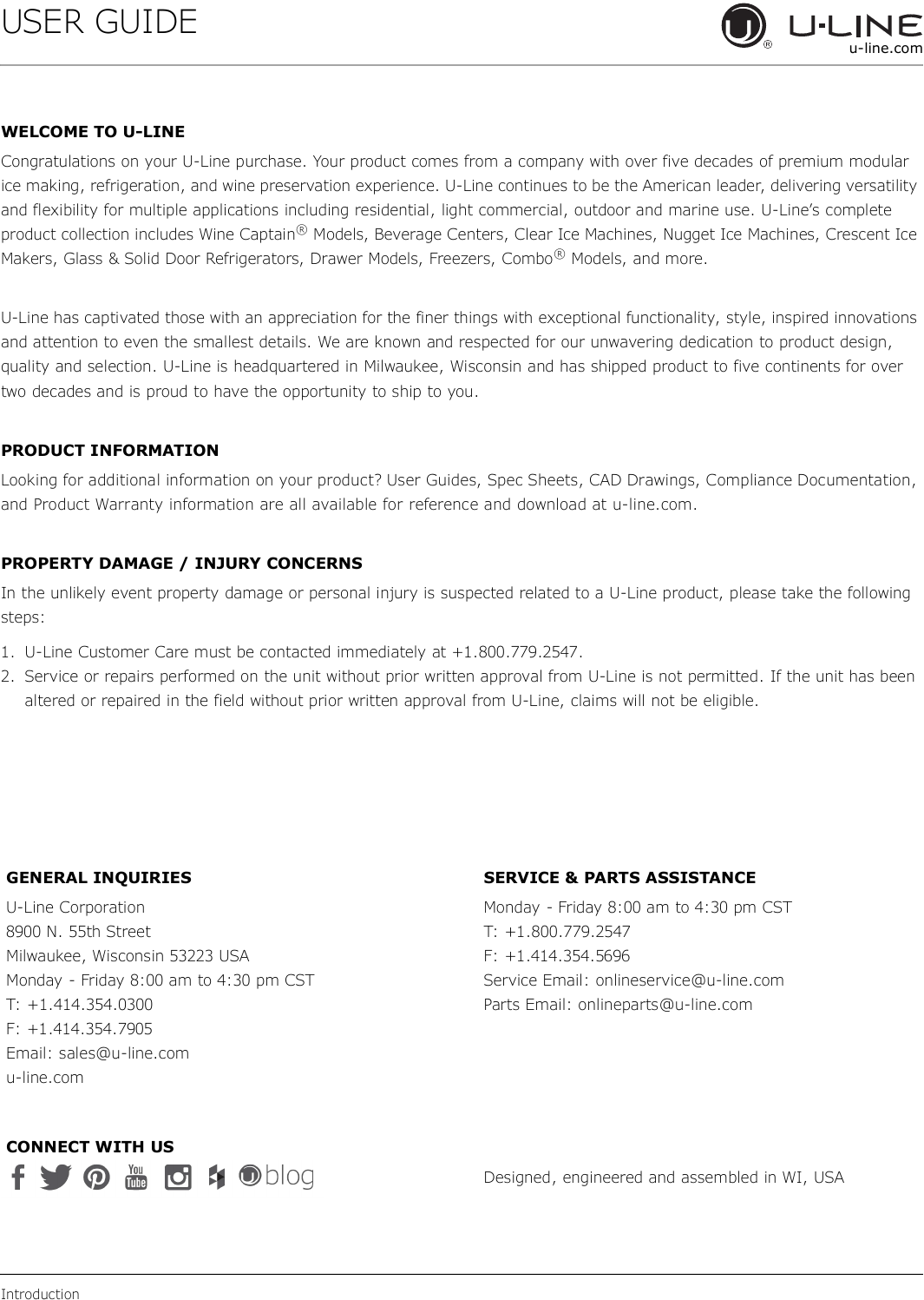 In the unlikely event property damage or personal injury is suspected related to a U-Line product, please take the following