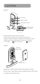 Lock Parts Exterior Touchscreen Fingerprint reader Message display screen Backup key hole Restart button Backup Key Hole: Used to insert key to unlock. Restart Button: Used to jump start the lock if activation fail. Fingerprint Reader: Used to press finger and unlocking from outside. Touchscreen: Used to enter code and unlocking from outside. 0-9 Numbers Return to previous Confirm Interior SN Label Reset Button Battery Cover Reset Button: Used to reset the lock to factory default settings.