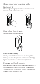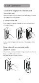 Lock Operation Clean the fingerprint reader and touchscreen Use a microfiber cloth to wipe across the fingerprint reader surface and the touch screen. Lock Activation Press finger on fingerprint reader or touch lock with back of hand or fingers. Lock will turn off again in 20 seconds if there are no other inputs. Open door from outside with user PIN code 1. Touch lock with back of hand or fingers to activate the lock. 2. Input user PIN code to unlock. 3. Rotate handle and open the door.
