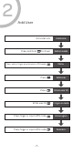 2 Add User Activate Lock Press and hold for 3 sec Press admin finger or enter admin PIN code Press 1 Welcome Admin code Menu Add user Press Enter user ID Enter user ID Finger or code Press finger or input a PIN code Enter again Press finger or input a PIN code Success -7-
