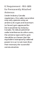 IC Requirement - RSS-GEN for Permanently Attached Antennas Under Industry Canada regulations, this radio transmitter may only operate using an antenna of a type and maximum (or lesser) gain approved for the transmitter by Industry Canada. To reduce potential radio interference to other users, the antenna type and its gain should be so chosen that the equivalent isotropically radiated power (e.i.r.p.) is not more than that necessary for successful communication.