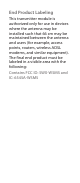 End Product Labeling This transmitter module is authorized only for use in devices where the antenna may be installed such that 66 cm may be maintained between the antenna and users (for example, access points, routers, wireless ADSL modems, and similar equipment).