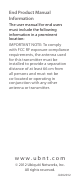 End Product Manual Information The user manual for end users must include the following information in a prominent location: IMPORTANT NOTE: To comply with FCC RF exposure compliance requirements, the antenna used for this transmitter must be installed to provide a separation distance of at least 66 cm from all persons and must not be co-located or operating in conjunction with any other antenna or transmitter. www.ubnt.com © 2012 Ubiquiti Networks, Inc. All rights reserved.