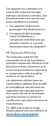 Cet appareil est conforme à la norme RSS Industrie Canada exempts de licence norme(s). Son fonctionnement est soumis aux deux conditions suivantes: 1. Cet appareil ne peut pas provoquer d’interférences et 2. Cet appareil doit accepter toute interférence, y compris les interférences qui peuvent causer un mauvais fonctionnement du dispositif.