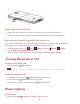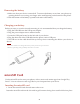 Removing the battery 1. Make sure that your device is turned off. To remove the battery cover from your phone, try opening the back cover using your finger at the small opening on the bottom of the phone. 2. Push the bottom of the battery upwards and remove the battery. Charging your battery Before you turn on your device and start using it, it is recommended that you charge the battery. 1. Plug the USB cable into the USB power adapter. 2. Plug the power adapter into a standard outlet. 3.