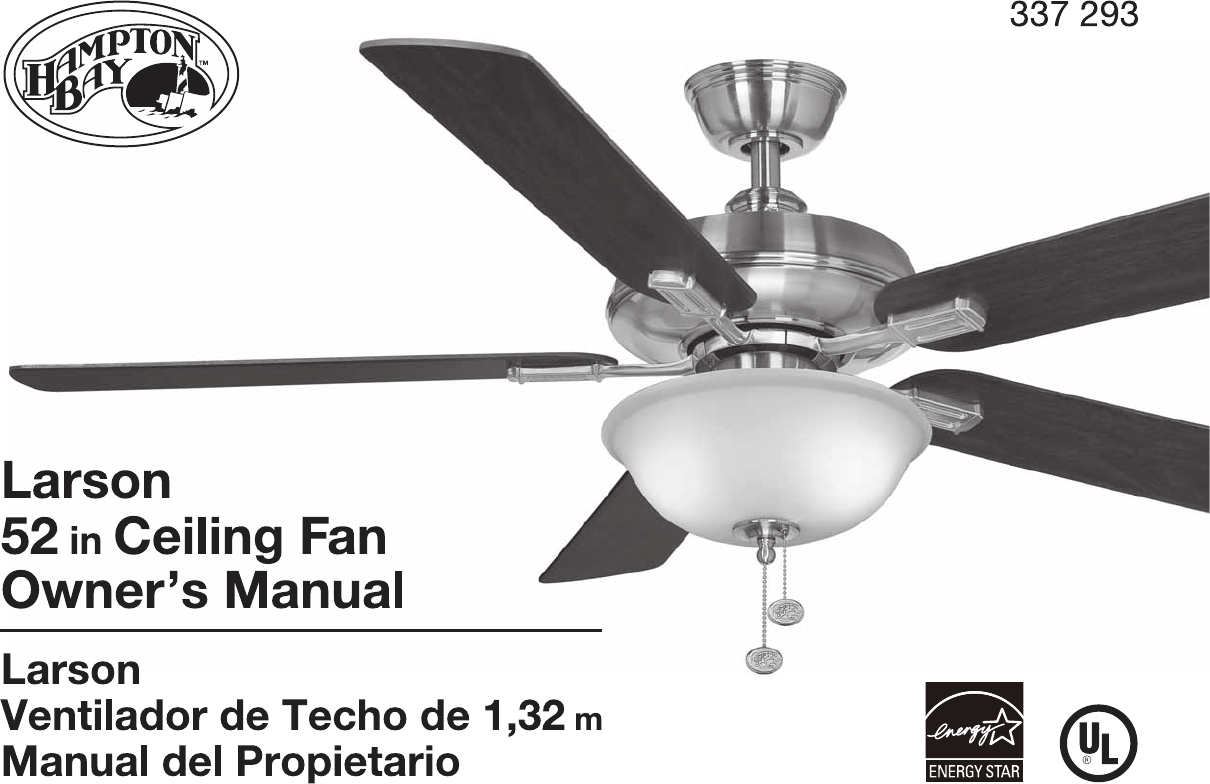 52” Larson Thank you for purchasing our ceiling fan. This product has been manufactured with the highest standards of safety and quality. Ceiling Fan by Hampton Bay Date Purchased Table of Contents Store Purchased Safety Rules . . . . . . . . . . . . . . . . . . . . 1 UL Model No. 337-293 Unpacking Your Fan . . . . . . . . . . . . . . 2 Installing Your Fan . . . . . . . . . . . . . . . 3 Serial No. Installing the Light Kit . . . . . . . . . . . 10 Operating Your Fan . . . . . . . . . . .