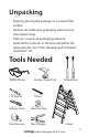 Unpacking • • • • Begin by placing the package on a covered flat surface. Remove all cardboard, packaging material and clear plastic bags. Dispose / recycle all packaging materials. Verify all the contents in the box and gather the required tools. See “Tools Needed” and “Included Quantities” list.