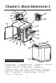 Chapter 1: About Adventurer 3 6 1 7 2 23 3 8 4 22 9 5 10 21 20 19 18 11 17 12 16 13 14 24 15 25 26 1.1 Components Introduce 1. Filament guide tube 2. Filament guide tube joint 3. Extruder base 4.Cooling Fan 5. Removable nozzle 6. Extruder cables 7. Clip 8. Led light 9. Air guide 10. Front door 11.Y-Axis sliding slot 12.Platform base 13. Removable build plate 14.Touch-screen 15.USB stick input 16.Power switch 17. Power input 18. Spool holder 19.Filament cover 20.