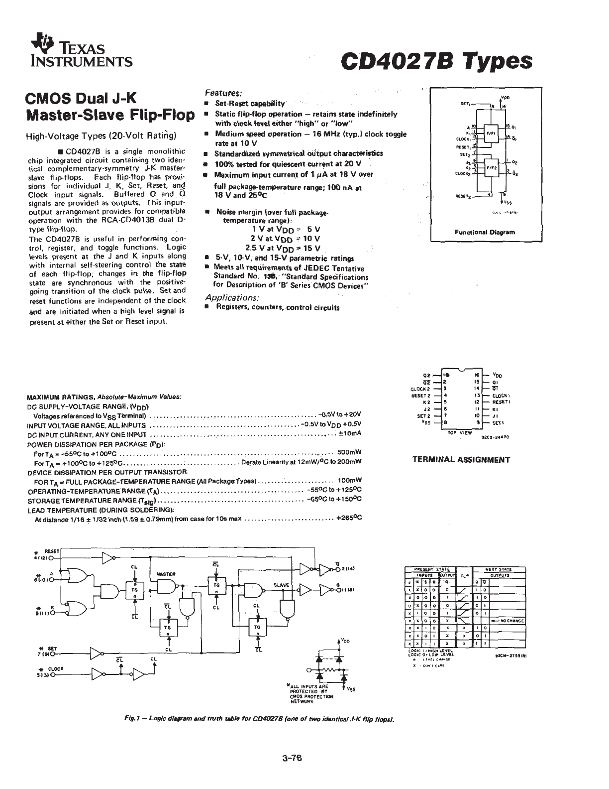 Data sheet acquired from Harris Semiconductor SCHS032C − Revised October 2003 The CD4027B types are supplied in 16-lead hermetic dual-in-line ceramic packages (F3A suffix), 16-lead dual-in-line plastic packages (E suffix), 16-lead small-outline packages (M, M96, MT, and NSR suffixes), and 16-lead thin shrink small-outline packages (PW and PWR suffixes).